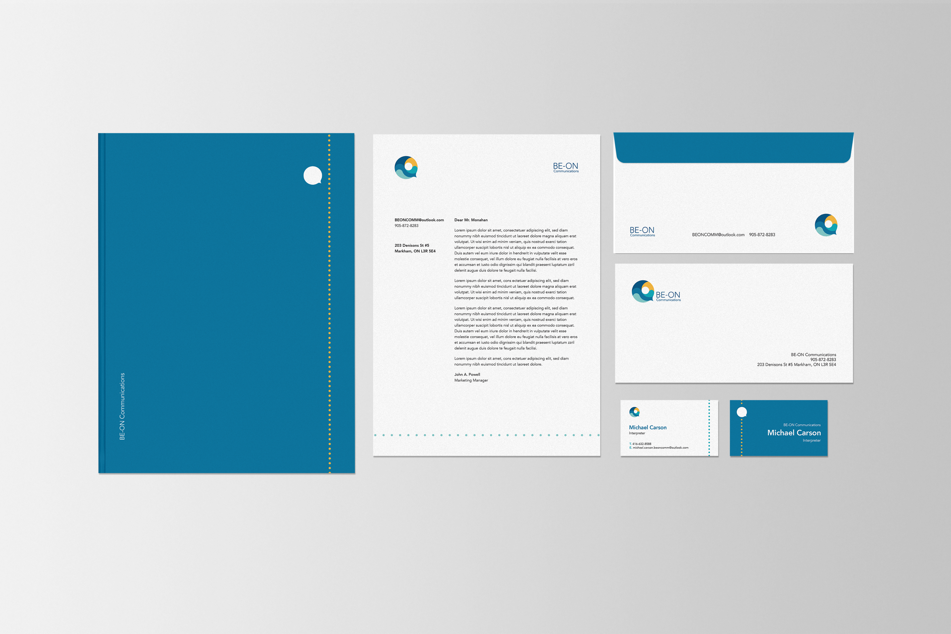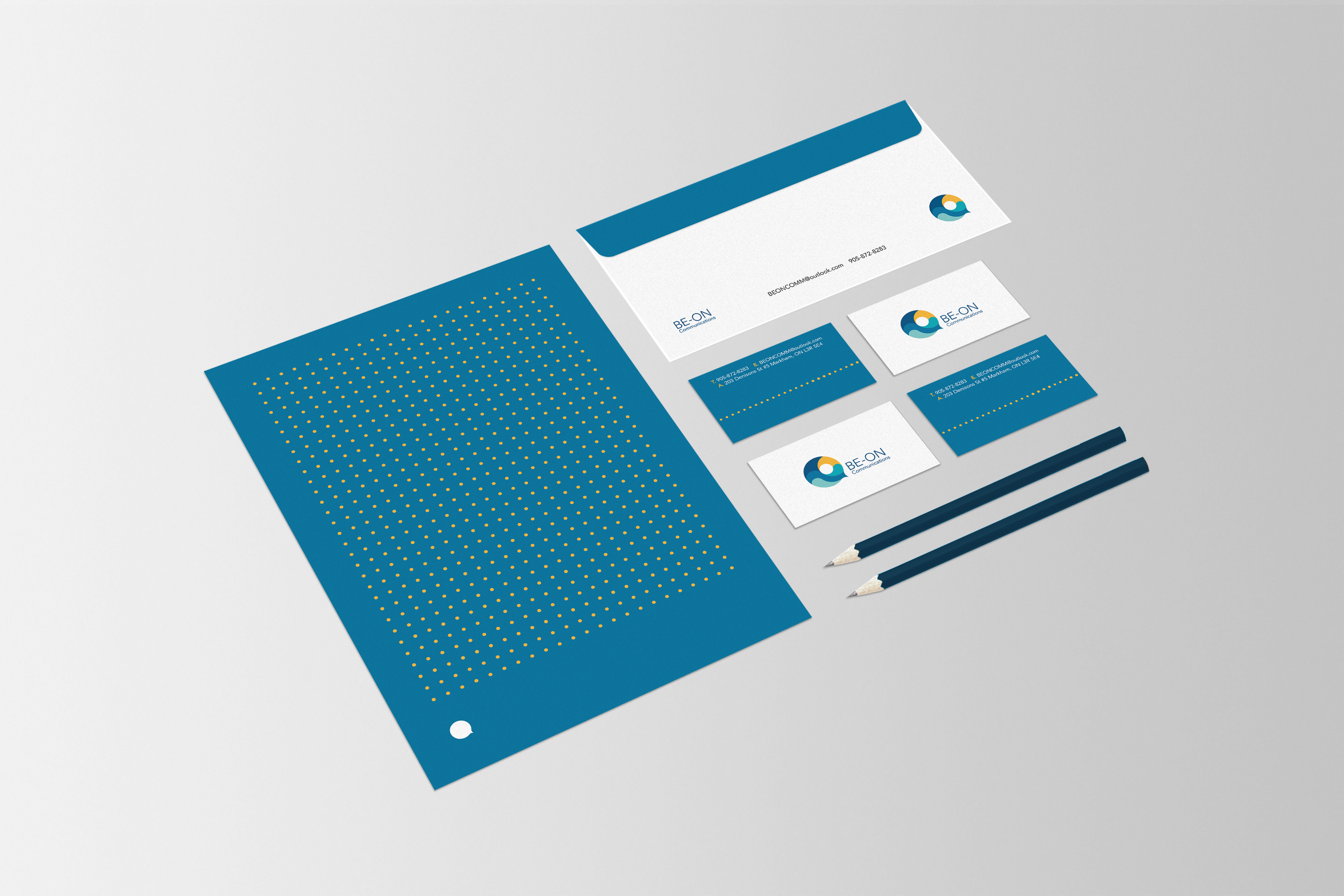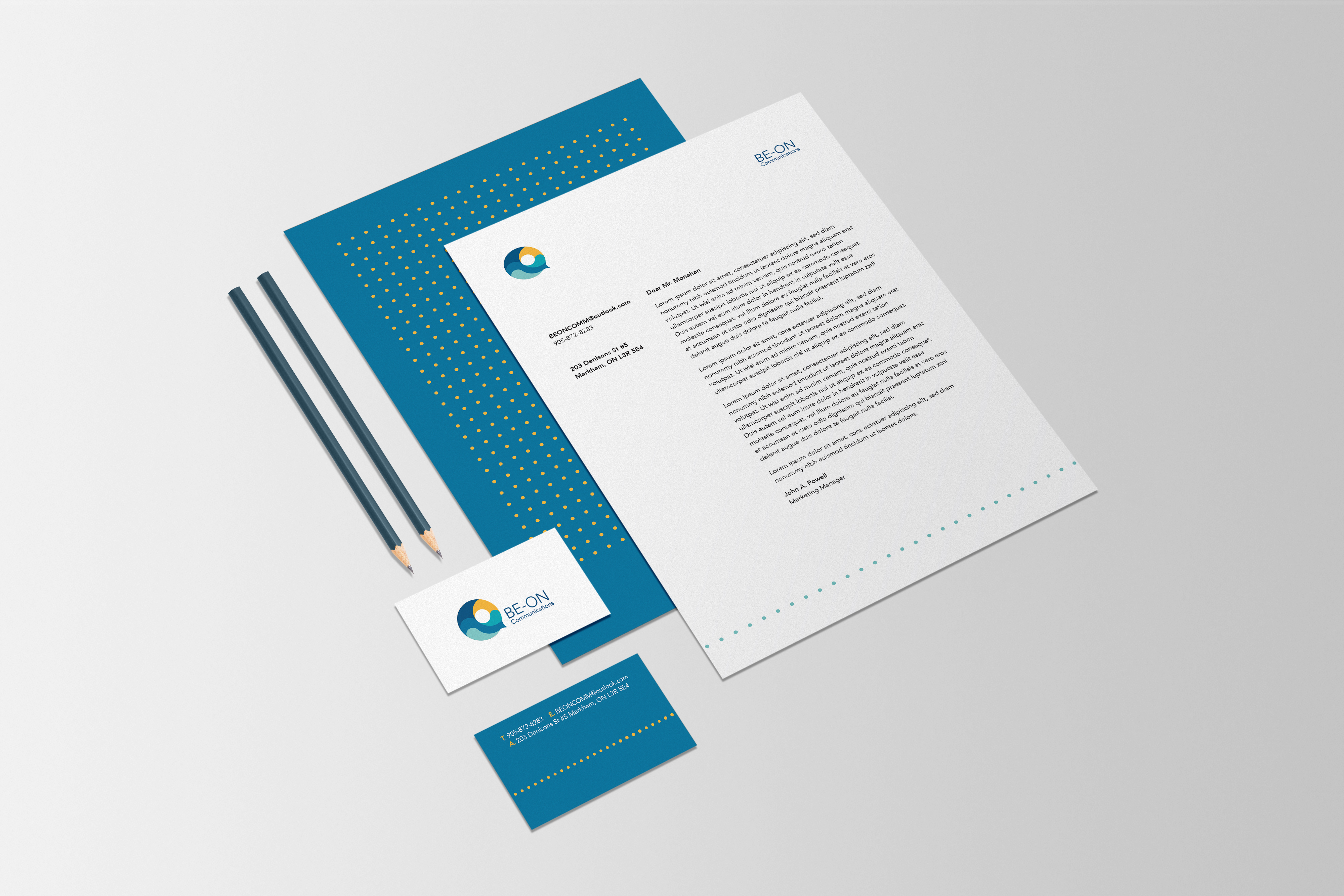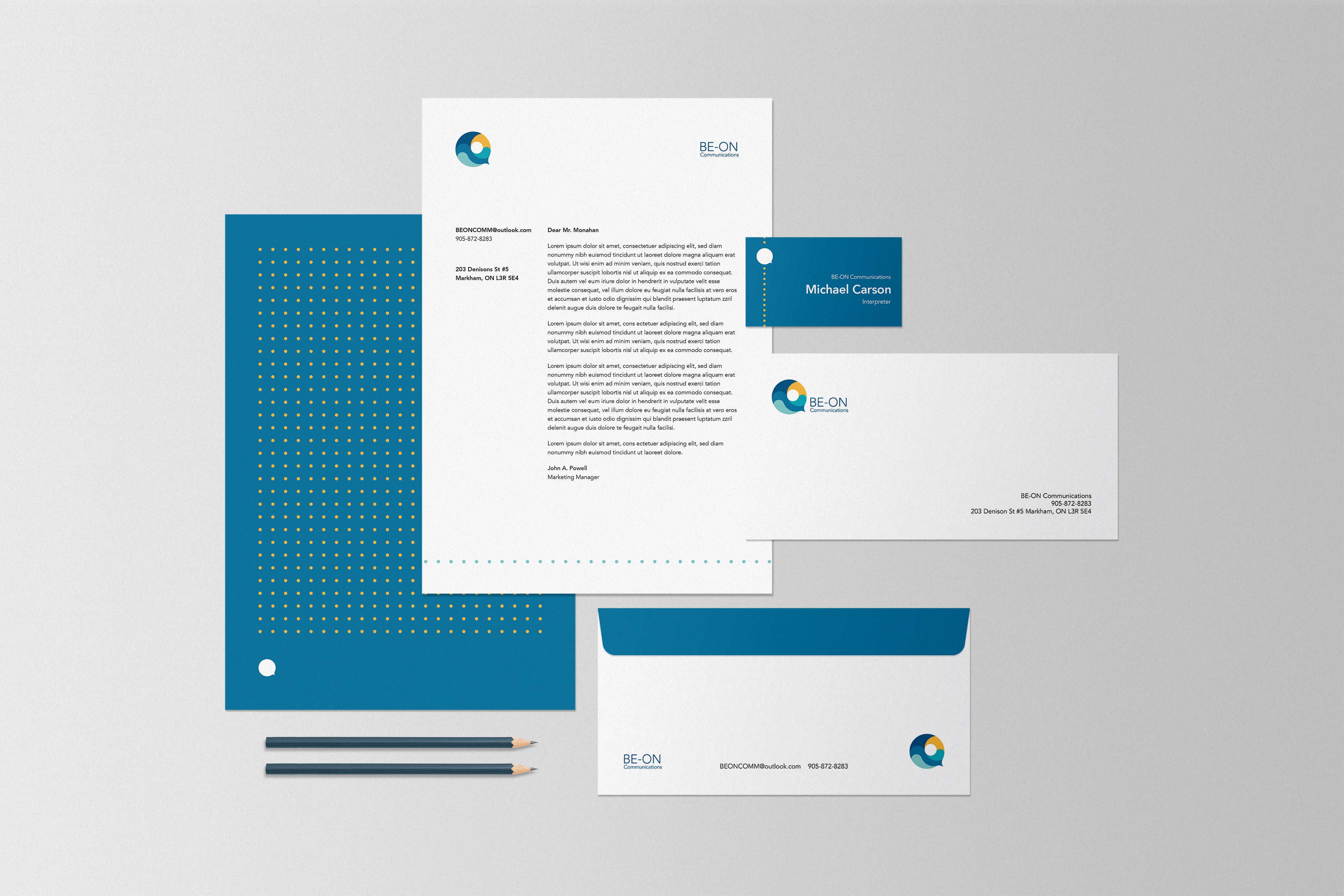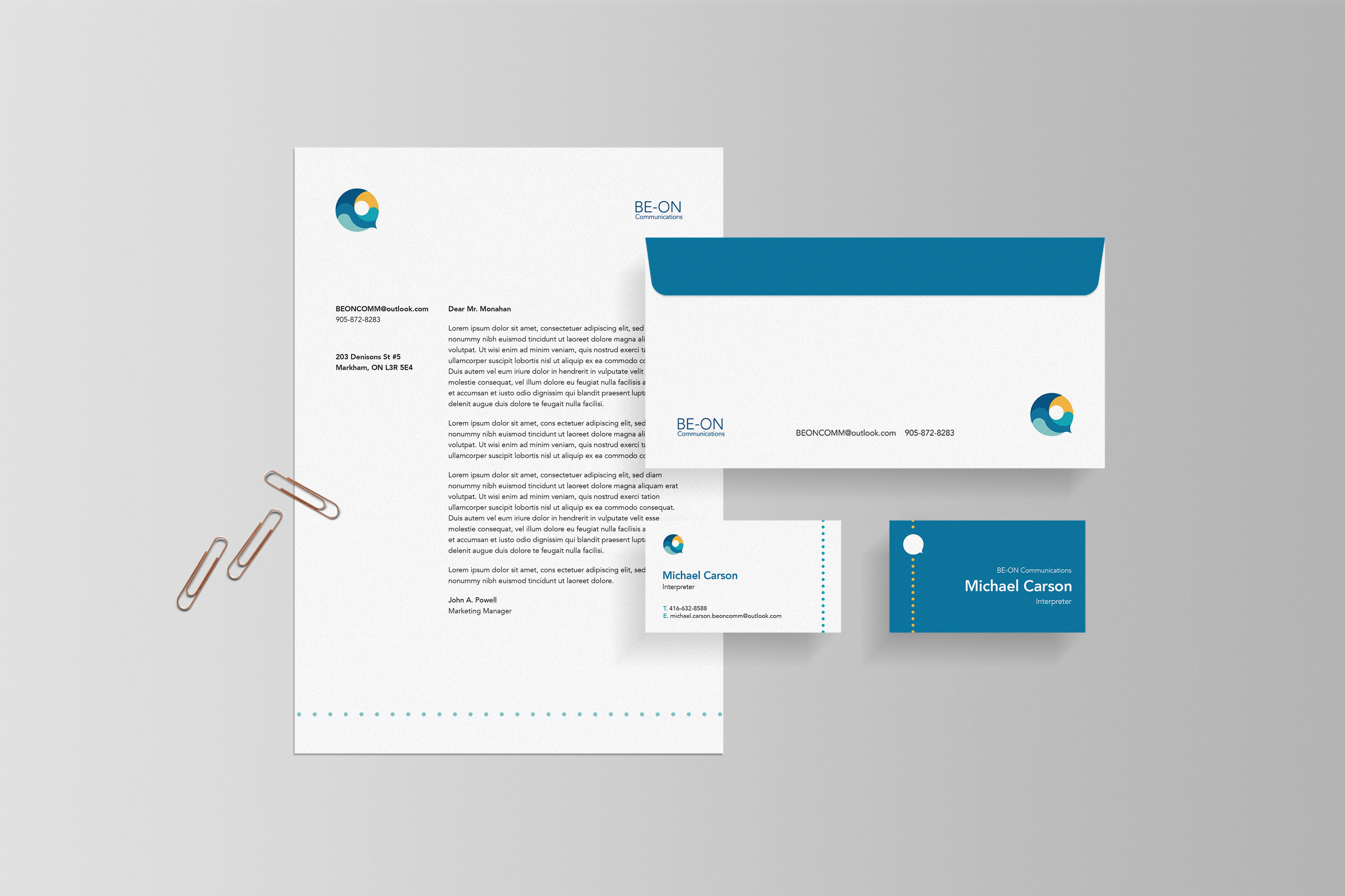 BE-ON Communications is a company that provides translation and interpretation services. They believe that the experience of a good translation service is like helping you to cross the water and reach the other side of the land; it will help you overcome the language barrier and understand the context. I used that visual as the inspiration for the logo design, which combines the speech bubble and ocean wave. While developing the stationery products, I kept the sensation of communication by using elements based on visual paths and communication symbols.